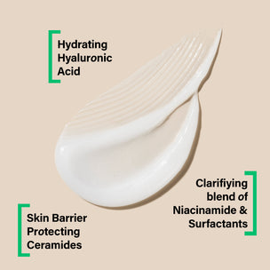 Clarifying blend of Niacinamide + Surfactants to lift makeup and impurities. H3 complex of Ceramides, Hyaluronic Acid + Glycerin to deeply hydrate.